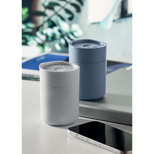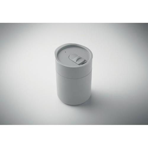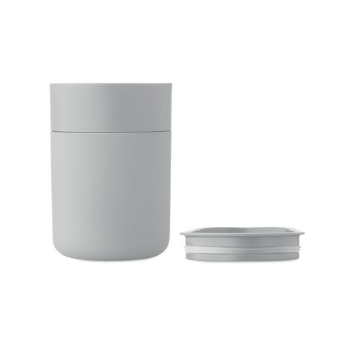 Gobelet en PP avec manchon en silicone et couvercle coulissant en PP. Capacité : 330 ml. Comme il s'agit d'un gobelet à simple paroi, un transfert de chaleur peut encore se produire.