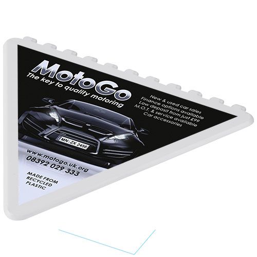 Grattoir triangulaire pour le pare- brise, avec une grande zone de marquage. Fabriqué au Royaume- Uni en plastique recyclé. Le grattoir à glace a une finition mouchetée due à la nature du matériau recyclé.