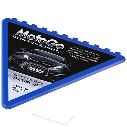 Grattoir triangulaire pour le pare- brise, avec une grande zone de marquage. Fabriqué au Royaume- Uni en plastique recyclé. Le grattoir à glace a une finition mouchetée due à la nature du matériau recyclé.