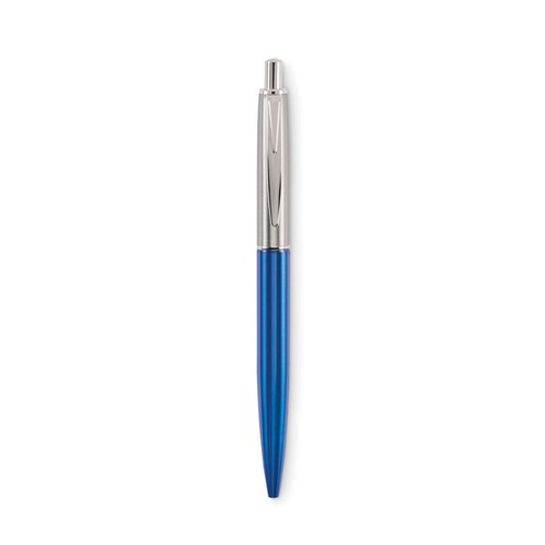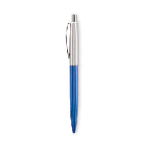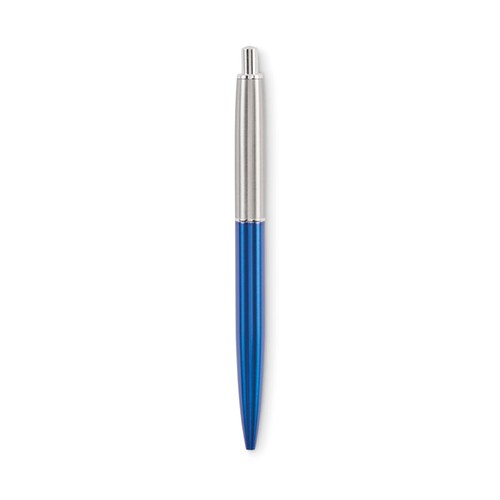 Stylo à bille à bouton poussoir dans un corps en acier inoxydable recyclé. Encre bleue. Présenté dans une boîte noire.
