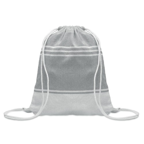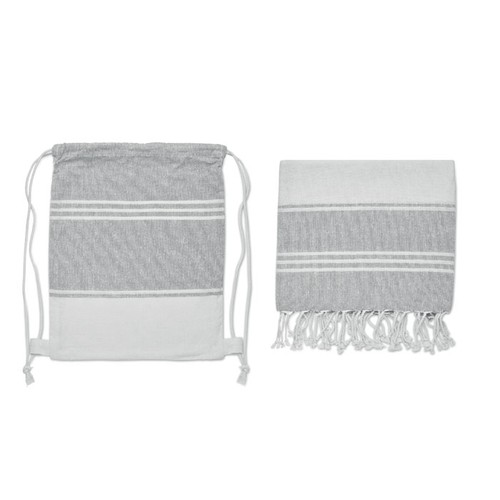 Fouta avec sac à cordon assorti. 70% coton recyclé et 30% polyester recyclé 180 gr/m². Fouta 90x160 cm.