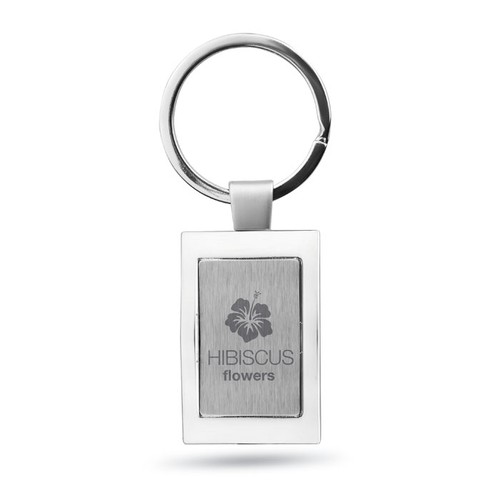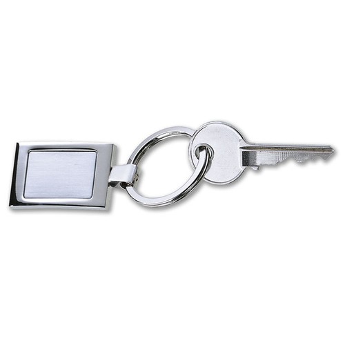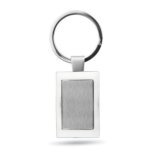 Porte- clés rectangulaire en alliage de zinc chromé avec espace mat. Emballage boite cadeau.