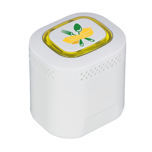 autonomie maxi de 4 heures. Vous pouvez le fixer à l‘anneau intégré, voire même à votre porte- clés. Livré avec câble de chargement 2 en 1 pouvant servir aussi d‘appareil de liaison avec l‘appareil audio grâce à une prise jack de 3,5 mm. Performance de sortie de 2 watt. La bague de couleur sur l‘espace publicitaire s‘allume via LED.