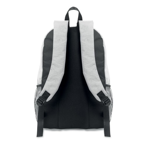 Sac à dos en polyester 600D RPET avec cordon et poche frontale zippée. Poches en filet sur les deux côtés.