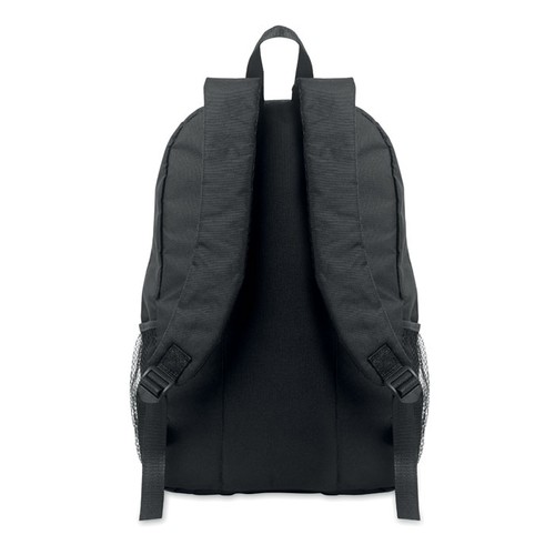 Sac à dos en polyester 600D RPET avec cordon et poche frontale zippée. Poches en filet sur les deux côtés.