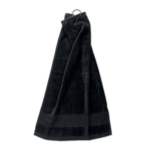 Serviette de golf en coton avec un trou en cuivre et un anneau sur le dessus pour la suspendre. 350 gr/m². Taille de la serviette : 40x60 cm.