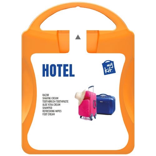 Le kit d'hôtel MyKit est idéal pour les voyages d'affaires ou les longues journées d'exposition. Contenu : 1 rasoir, 1 gel à raser, 1 crème à l'Aloe Vera, 1 shampooing, 1 gel pour les pieds, 1 lime à ongles, 1 brosse à dents et 1 dentifrice. Tous les produits de premiers secours et de soin du kit répondent à toutes les réglementations européennes applicables. Le prix comprend le marquage sur toute la surface.
