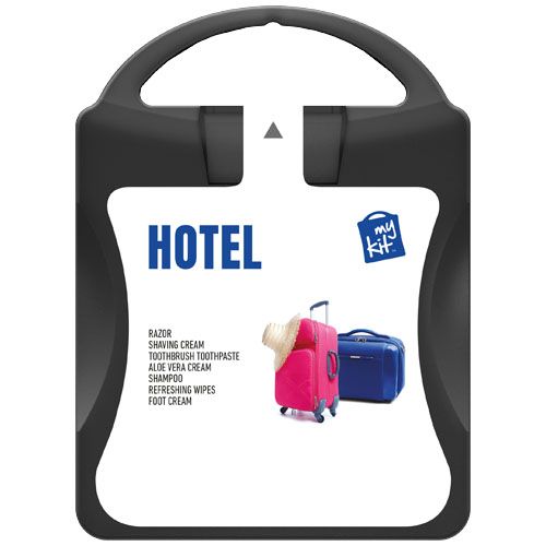 Le kit d'hôtel MyKit est idéal pour les voyages d'affaires ou les longues journées d'exposition. Contenu : 1 rasoir, 1 gel à raser, 1 crème à l'Aloe Vera, 1 shampooing, 1 gel pour les pieds, 1 lime à ongles, 1 brosse à dents et 1 dentifrice. Tous les produits de premiers secours et de soin du kit répondent à toutes les réglementations européennes applicables. Le prix comprend le marquage sur toute la surface.