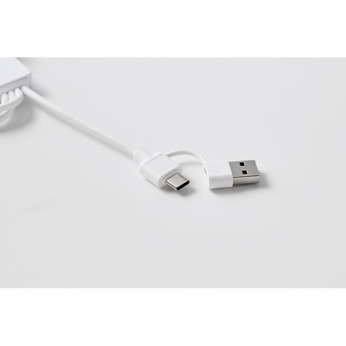 Porte- clés 2 en 1 avec câble de chargement avec entrée type- C & type- A. Sortie : Chargement des montres (Samsung® et Apple®), 2 x type- C et micro- B (2 en 1 broche). Câble en TPE recyclé.