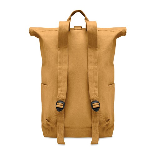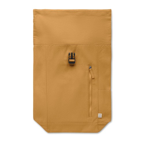 Sac à dos enroulable avec fermeture auto- agrippante en coton recyclé (80%) et polyester recyclé (20%) de 390 gr/m². Poche frontale zippée.