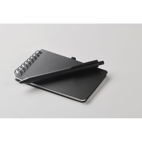 Bloc- notes hydrofuge avec une couverture en PP avec stylo. Spirale. Papier minéral 120 gr/m², 50 feuilles lignées. Encre bleue. Fermeture élastique et porte- stylo.