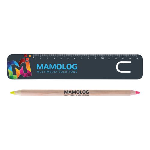 KIT BUREAU bi- coul comprenant 1 REGLE CARTON 15 cm + 1 CRAYON bi- coul FLUO- FLUO 17,6 cm Prestige Naturel, taillé des 2 côtés, VERNIS INCOLORE