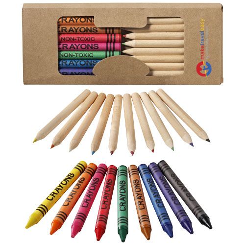 9 crayons de cire de couleur et 10 crayons de couleur dans une boîte en carton avec fenêtre en plastique. Marquage indisponible sur les composants.