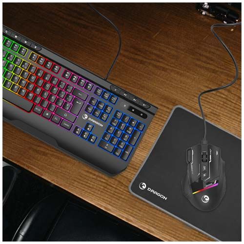Le kit de jeu Dragon comprend un clavier, une souris, un casque et un tapis de souris. Le clavier est livré avec un câble USB tressé de 1,5 mètre. Le design ergonomique de la souris et le long câble permettent une excellente liberté de mouvement ainsi qu'une prise en main confortable pour jouer pendant des heures. Le casque offre une isolation totale grâce aux oreillettes souples et confortables de 40 mm. Il comprend également un haut- parleur et un câble USB en PVC de 2,1 mètres. La texture lisse du tapis de souris assure un excellent contrôle et une fluidité optimale avec tout type de souris.