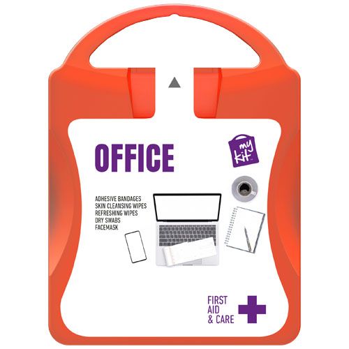 Ce kit de bureau MyKit devrait être sur tous les lieux de travail pour être prêt en cas de petites blessures ou d'urgences. Contenu : 12 pansements résistants au lavage, 2 tampons secs, 1 masque facial, 1 lingette rafraîchissante et 4 tampons nettoyants pour la peau. Tous les produits de premiers secours et de soin du kit répondent à toutes les réglementations européennes applicables. Le prix comprend le marquage sur toute la surface.