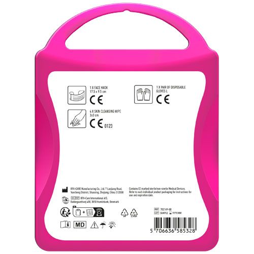 Kit de protection pratique, à conserver à la maison, dans la voiture ou pour emporter en vacances. Contenu du kit : 1 masque facial, 4 lingettes nettoyantes pour les mains et 1 paire de gants. Tous les éléments du kit répondent à toutes les réglementations européennes applicables. Le prix comprend le marquage sur toute la surface.