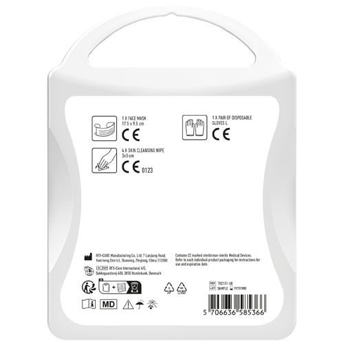 Kit de protection pratique, à conserver à la maison, dans la voiture ou pour emporter en vacances. Contenu du kit : 1 masque facial, 4 lingettes nettoyantes pour les mains et 1 paire de gants. Tous les éléments du kit répondent à toutes les réglementations européennes applicables. Le prix comprend le marquage sur toute la surface.