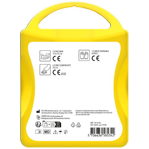 Kit de protection pratique, à conserver à la maison, dans la voiture ou pour emporter en vacances. Contenu du kit : 1 masque facial, 4 lingettes nettoyantes pour les mains et 1 paire de gants. Tous les éléments du kit répondent à toutes les réglementations européennes applicables. Le prix comprend le marquage sur toute la surface.
