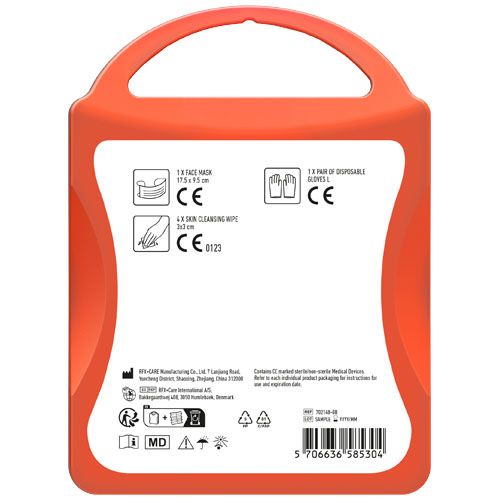 Kit de protection pratique, à conserver à la maison, dans la voiture ou pour emporter en vacances. Contenu du kit : 1 masque facial, 4 lingettes nettoyantes pour les mains et 1 paire de gants. Tous les éléments du kit répondent à toutes les réglementations européennes applicables. Le prix comprend le marquage sur toute la surface.