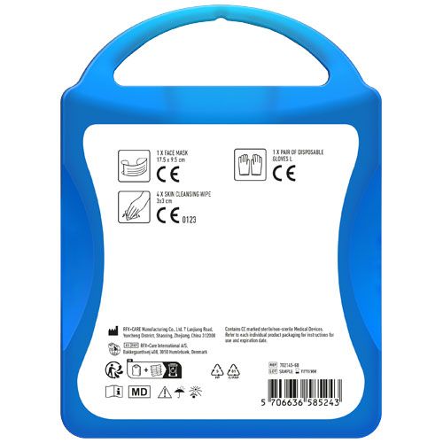 Kit de protection pratique, à conserver à la maison, dans la voiture ou pour emporter en vacances. Contenu du kit : 1 masque facial, 4 lingettes nettoyantes pour les mains et 1 paire de gants. Tous les éléments du kit répondent à toutes les réglementations européennes applicables. Le prix comprend le marquage sur toute la surface.