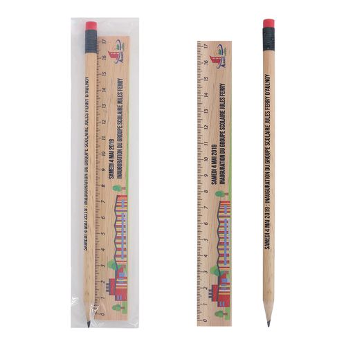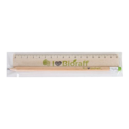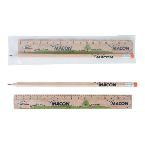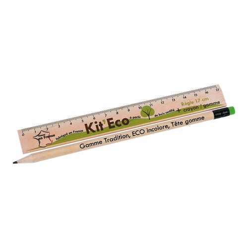 KIT ECO comprenant 1 REGLE BOIS ECO 17 cm SANS VERNIS + 1 CRAYON 19 cm ECO, ROND, VERNIS INCOLORE, tête gomme