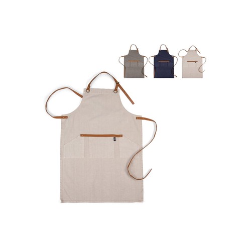 Tablier en pur coton avec sangle réglable au niveau du cou et trois poches à la taille. Bretelles et détails en cuir PU.