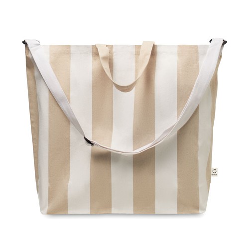 Très grand sac de plage rayé en coton recyclé (80%) et polyester recyclé (20%) de 280 gr/m² avec poche intérieure. Poignées courtes et une grande bandoulière réglable.