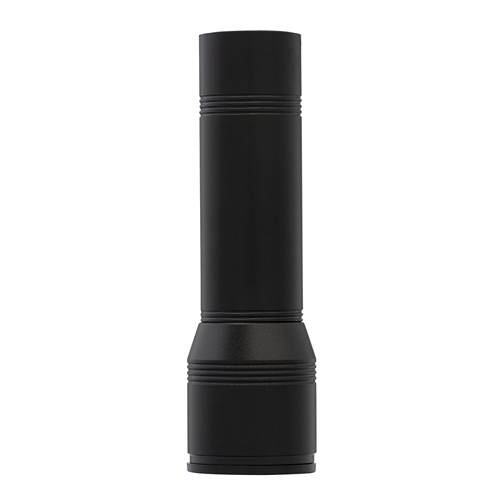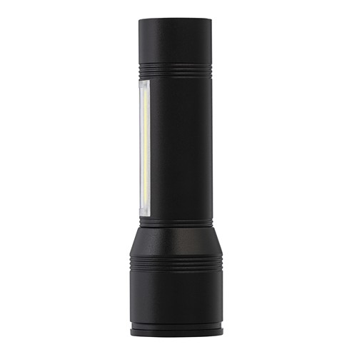 Cette lampe de poche rechargeable en aluminium est disponible en argenté ou noir anodisé. Elle possède un éclairage LED avec zoom du faisceau lumineux et un éclairage COB sur le côté. Une bande de préhension noire se trouve à hauteur de la tête de la lampe de poche.