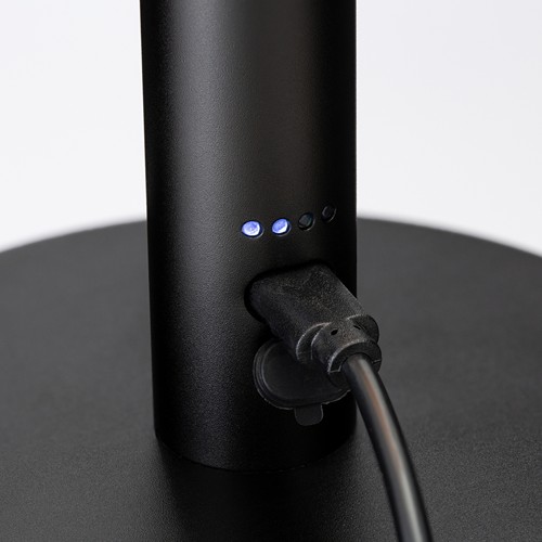 La lampe est allumée et éteinte par un point tactile sur la barre et est réglée en intensité sur trois niveaux (100 %, 50 %, 10 %). La batterie est chargée à l’aide du port USB- C et du câble fourni, le témoin de charge indique l’état de charge restant.