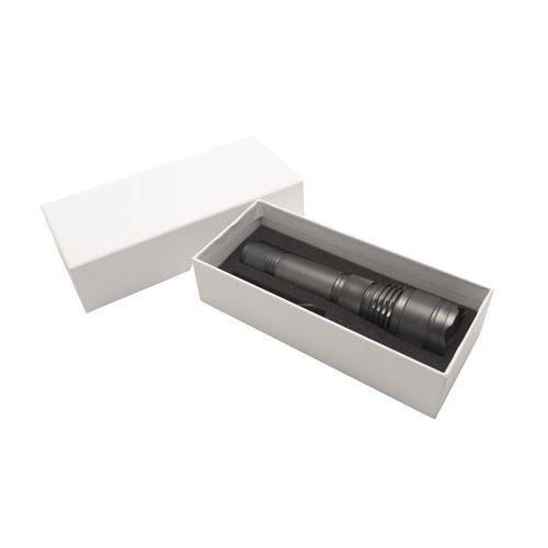 Manche en aluminium anodisé. LED 10W CREE XPE. 3 modes d'éclairage (100% , 30% ou clignotant). Système de focus permettant d'augmenter la distance maximum d'éclairage en concentrant le faisceau. Joints sur chaque pas de vis pour une meilleure étanchéité (ne pas immerger). Bouton on / off au talon de la lampe de poche. Fonctionne avec une batterie rechargeable de 2000 mAh. Autonomie : 5h Livrée avec un câble d'alimentation micro- USB. Puissance de la LED : 10W (750 lumens). Longueur du faisceau : 200m. Niveau d'étanchéité : IPX-4. Livrée dans un coffret cadeau en carton.