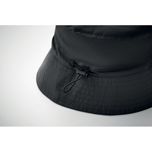 Chapeau de pêcheur déperlant en polyester, livré avec une pochette en tissu avec mousqueton en ABS. 64 gr/m².