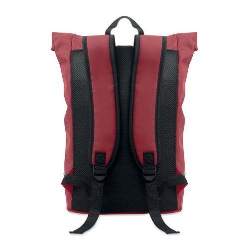 Sac à dos enroulable pour ordinateur portable 15 pouces en PU souple avec dos rembourré, base renforcée et bande réfléchissante. Poche frontale étanche avec fermeture éclair. doublure en polyester 210D RPET.