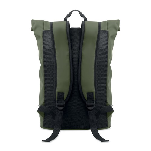 Sac à dos enroulable pour ordinateur portable 15 pouces en PU souple avec dos rembourré, base renforcée et bande réfléchissante. Poche frontale étanche avec fermeture éclair. doublure en polyester 210D RPET.