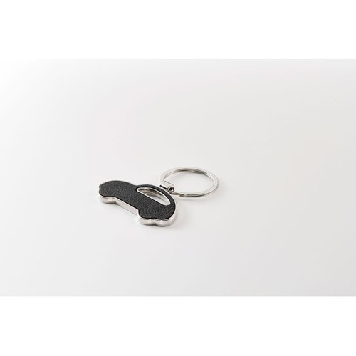 Porte- clés en métal en forme de voiture avec incrustation en cuir PU recyclé.