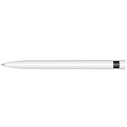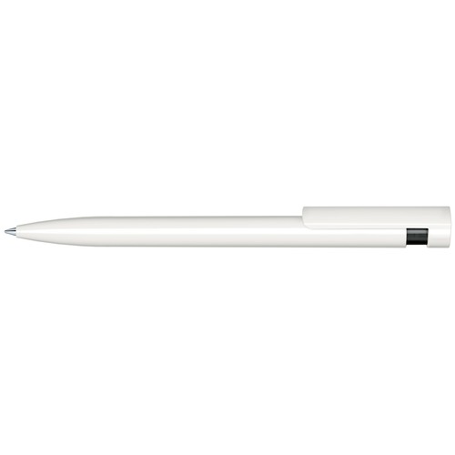 Stylo à bille rétractable avec corps et clip en plastique opaque blanc et partie haute en plastique transparent de couleur.