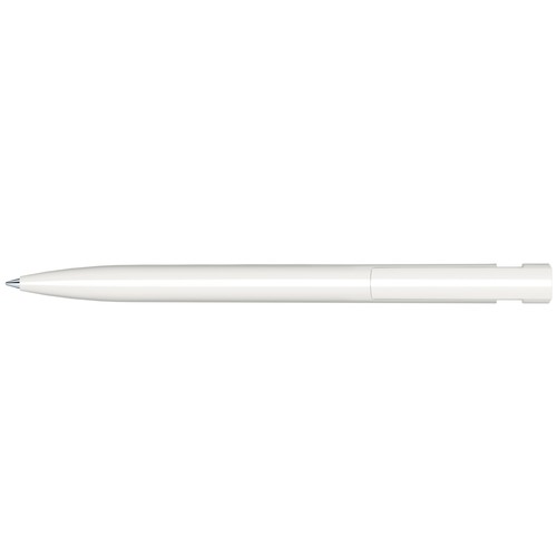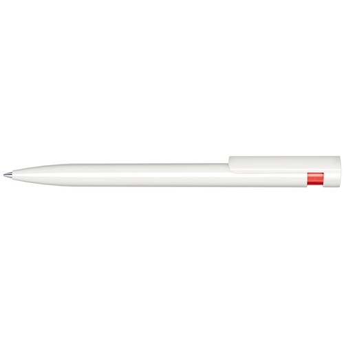 Stylo à bille rétractable avec corps et clip en plastique opaque blanc et partie haute en plastique transparent de couleur.