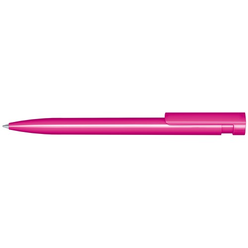 Stylo à bille rétractable avec corps et clip en plastique opaque.