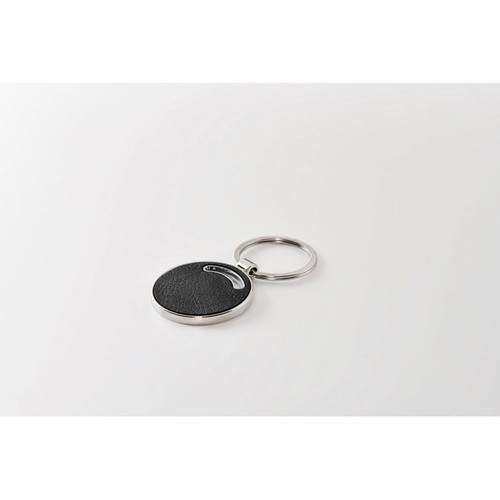 Porte- clés en métal de forme ronde avec incrustation en cuir PU recyclé.