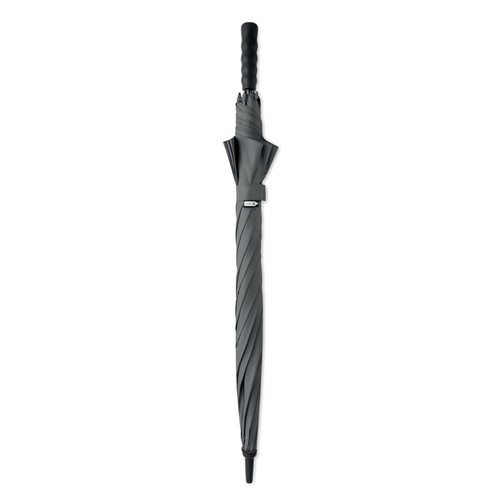 Parapluie coupe- vent 27 pouces à ouverture automatique en pongé RPET 190T. Mât et baleines en fibre de verre. Poignée en paille de blé et ABS recyclée. Embouts et capuchon en plastique.