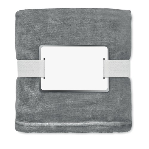 Couverture en polaire flanelle RPET 280 gr/m² enveloppée d'un ruban et d'une carte imprimable.