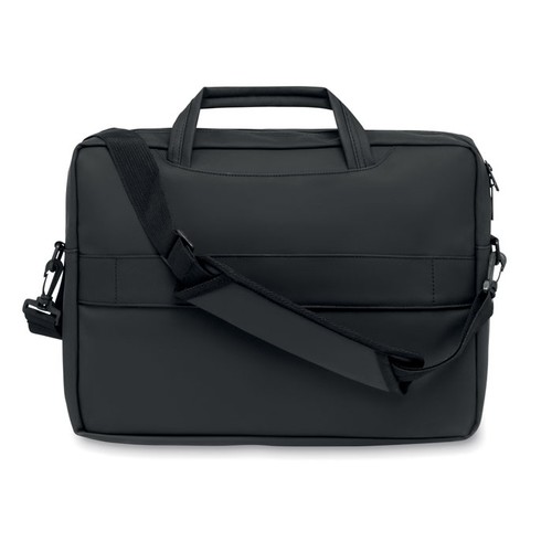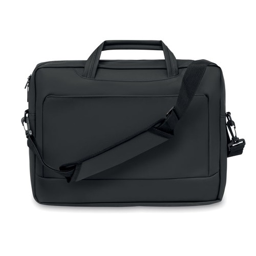 Sacoche pour ordinateur portable 15'' en PU souple avec dos rembourré. Un compartiment principal rembourré pour ordinateur portable et une poche avant zippée avec plusieurs compartiments. Doublure en polyester RPET 210D. 2 poignées et une bandoulière réglable et amovible et passant pour trolley au dos.