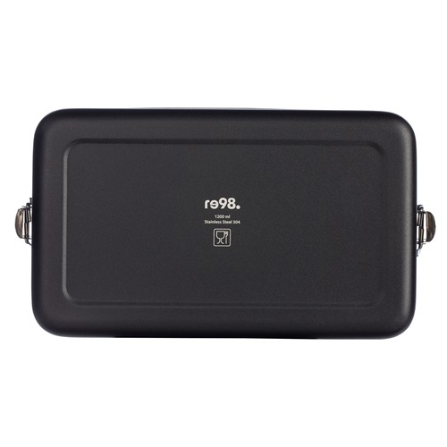 RE98- Lunchbreak est un compagnon optimal pour tous ceux qui doivent régulièrement apporter leur déjeuner au travail, qui prévoient un pique- nique ou qui veulent préparer des repas pour la route. La boîte à lunch d’une contenance de 1200 ml est équipée d’un joint en silicone sous le couvercle qui empêche les fuites. Deux clips de fermeture assurent une fixation sûre du couvercle et permettent en même temps de l’ouvrir facilement. La surface noire revêtue par poudre complète le look discret. Notre boîte en métal est une alternative écologique aux boîtes en plastique.