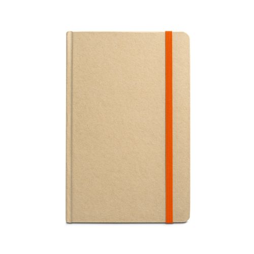 Bloc- notes A5 avec 160 pages lignes (60 g/m²), fabriquées en papier 100% recyclé, et couverture dur en papier 100% recyclé. Contient un élastique et un ruban de séparation de la même couleur. 137 x 210 mm