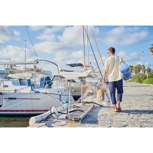 Sac de sport en tissus recyclés (60% coton recyclé, 40% polyester recyclé) en 320 gr/m² avec poignée en sangle de coton naturel et une bandoulière réglable et amovible.
