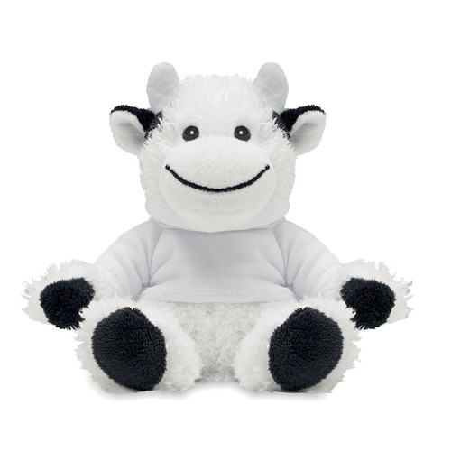 Vache en peluche portant un pull à capuche. Idéal pour l'impression par sublimation.