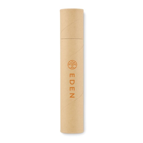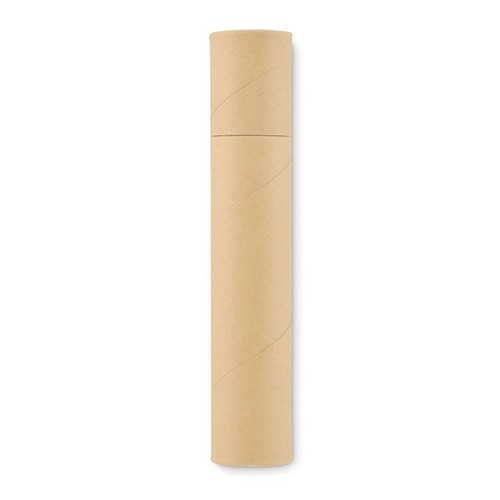 Tube en papier recyclé comprenant 2 crayons, 1 stylo à bille en carton, 1 taille- crayon en bois et 1 gomme.