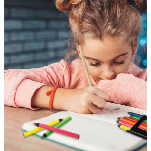 Boîte de 6 crayons de couleur fluorescents en bois pour le coloriage. 90 x 10 x 48 mm