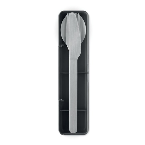 Set de couverts en acier inoxydable avec étui en PP. Ce set comprend une fourchette, un couteau et une cuillère.