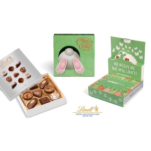 Neuf délicieux Mini Pralinés Lindt présentés dans une boîte promotionnelle pop- up au design de Pâques.
