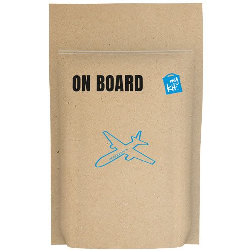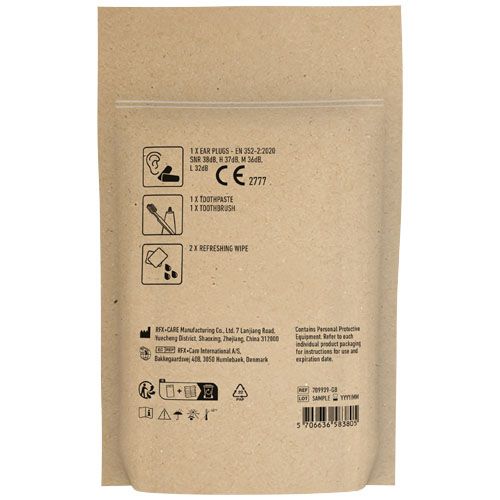 Le kit pour se rafraichir à bord. Contient:1 brosse à dents, 1 tube de dentifrice, 2 bouchons anti bruit, 2 lingettes rafraichissantes. Tous les contenus à l'intérieur des kits sont conformes à la législation européenne. Le prix comprend l'étiquette personnalisée. Livré en pochette papier.